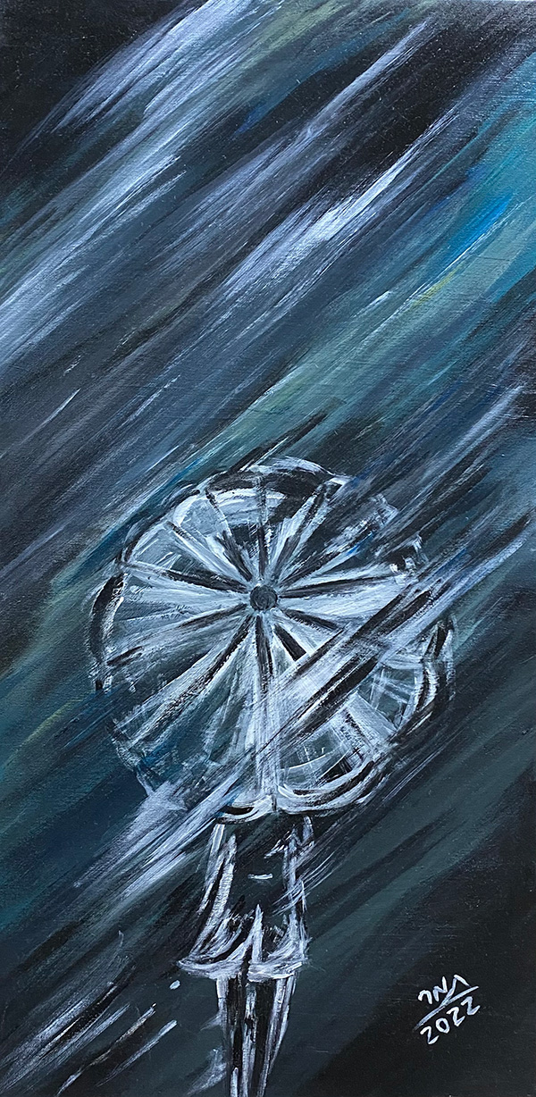 He stood there waiting, shivering from the cold, almost drenched by frozen drops. He opened his umbrella and felt safe to continue waiting without hesitation or despair, knowing it would come.