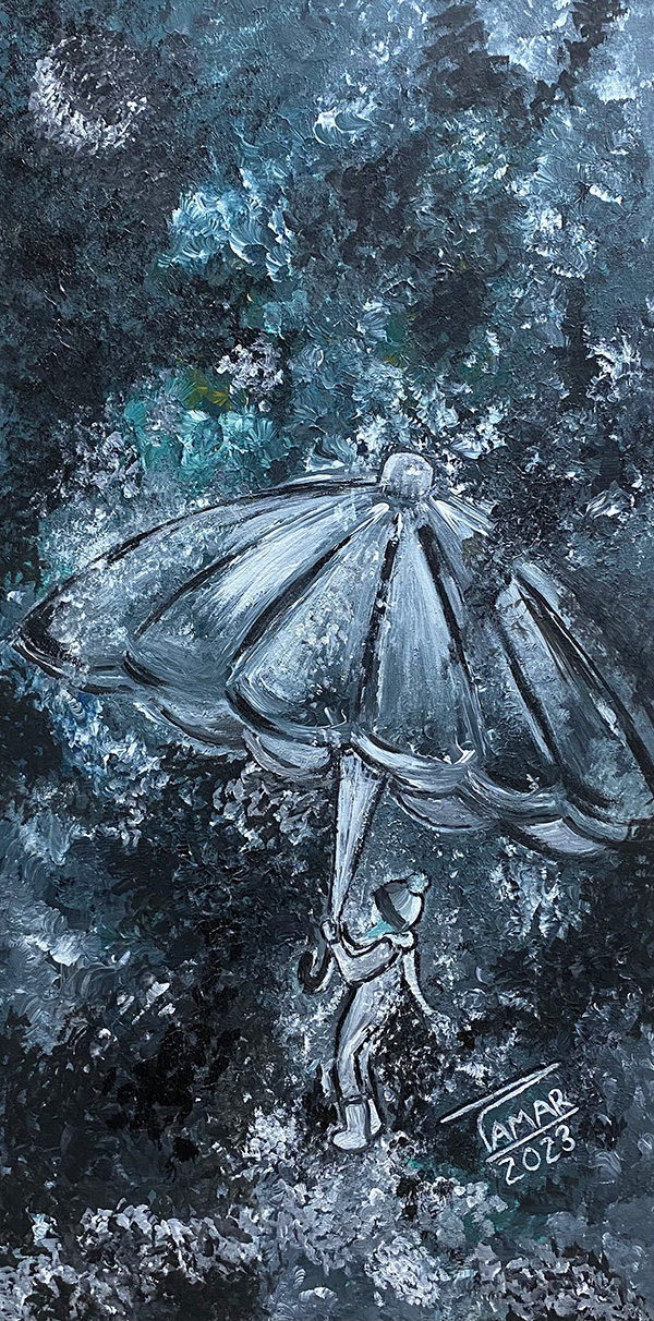 “Draw me an umbrella,” Yonatan asked. “Draw me an umbrella held by a child, and remember to write that you painted it for me.” I couldn’t refuse such a pure request, and here it is.